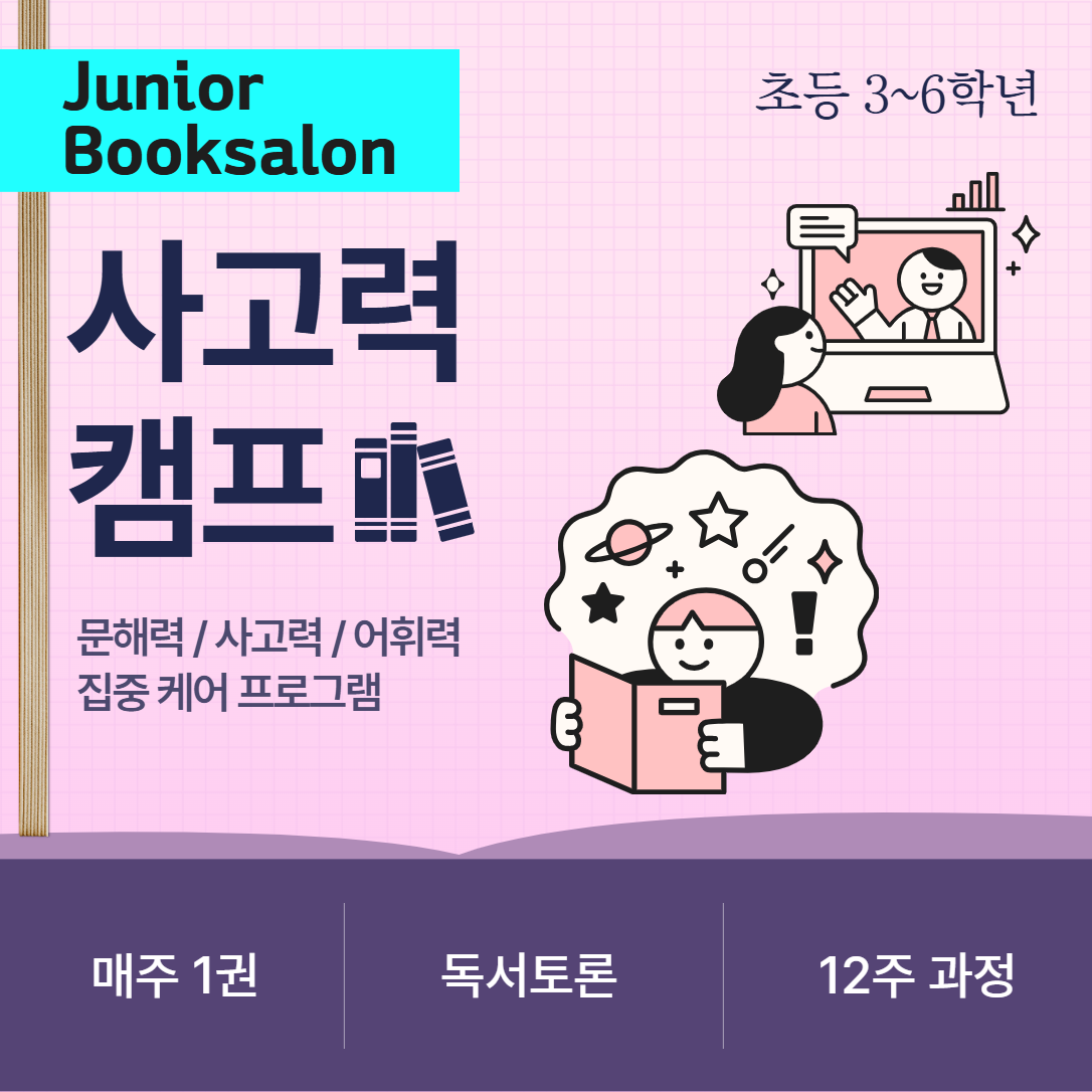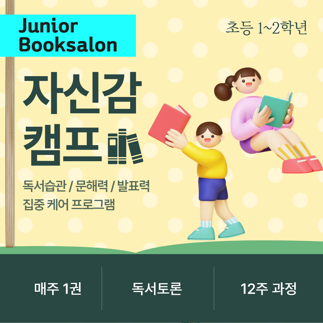 [3월개강]2026 자신감캠프 18기 모집(초1~2학년) 문해력 자신감을 키우는 3개월 프로젝트! [3월개강]2026 사고력캠프 18기(초3~6학년) 교과연계 문해력향상 프로젝트! [3월개강]2026 자신감유치원 14기(3개월과정) 내년 학교갈 준비해요! 한글자신감, 발표자신감을 키워요! [2월개강]2026 자신감캠프 17기 모집(초1~2학년) 문해력 자신감을 키우는 3개월 프로젝트! [2월개강]2026 사고력캠프 17기(초3~6학년) 교과연계 문해력향상 프로젝트! [적립금혜택]2026 겨울방학 집중캠프(8주과정/1월개강) 본격방학, 독서방학만드는 8주 프로젝트! [마감][마감임박]2025 겨울방학특강 읽는겨울(12월개강) 책과 보내는 나만의 멋진 독서 방학 만들기! [11월개강]2025 자신감유치원 13기(3개월과정) 내년 학교갈 준비해요! 한글자신감, 발표자신감을 키워요! [11월개강]2025 자신감캠프 16기 모집(초1~2학년) 문해력 자신감을 키우는 3개월 프로젝트! [11월개강]2025 사고력캠프 16기(초3~6학년) 교과연계 문해력향상 프로젝트! [적립금10만원혜택]제6회 초등 독서습관 챌린지(선착순100명) 6개월동안 책읽기 챌린지 미션! (초1~초6) [10월개강]2025 자신감유치원 12기(3개월과정) 내년 학교갈 준비해요! 한글자신감, 발표자신감을 키워요! [10월개강]2025 자신감캠프 15기 모집(초1~2학년) 문해력 자신감을 키우는 3개월 프로젝트! [10월개강]2025 사고력캠프 15기(초3~6학년) 교과연계 문해력향상 프로젝트! [9월개강]2025 자신감유치원 11기(3개월과정) 내년 학교갈 준비해요! 한글자신감, 발표자신감을 키워요! [9월개강]2025 자신감캠프 14기 모집(초1~2학년) 문해력 자신감을 키우는 3개월 프로젝트! [9월개강]2025 사고력캠프 14기(초3~6학년) 교과연계 문해력향상 프로젝트! [적립금혜택]2025 방학집중캠프(5주과정/7월28일개강) 짧은방학, 2배로 알차게 보내기! [마감][마감임박]2025 여름방학특강 읽는여름(7월개강) 올 여름, 책 읽는 아이 만들기 대작전! [6월개강]2025 자신감유치원 10기(3개월과정) 내년 학교갈 준비해요! 한글자신감, 발표자신감을 키워요! [6월개강]2025 사고력캠프 13기(초3~6학년) 교과연계 문해력향상 프로젝트! [마감][6월개강]2025 자신감캠프 13기 모집(초1~2학년) 문해력 자신감을 키우는 3개월 프로젝트! [5월개강]2025 자신감캠프 12기 모집(초1~2학년) 문해력 자신감을 키우는 3개월 프로젝트! [5월개강]2025 사고력캠프 12기(초3~6학년) 교과연계 문해력향상 프로젝트! [적립금10만원혜택]제5회 초등 독서습관 챌린지(선착순100명) 6개월동안 책읽기 챌린지 미션! (초1~초6) [4월개강]2025 자신감캠프 11기 모집(초1~2학년) 문해력 자신감을 키우는 3개월 프로젝트! [4월개강]2025 사고력캠프 11기(초3~6학년) 교과연계 문해력향상 프로젝트! [3월개강]2025 사고력캠프 10기(초3~6학년) 새학기 교과연계 몰입독서 프로젝트! [3월개강]2025 자신감캠프 10기 모집(초1~2학년) 독서자신감을 키우는 새학기 3개월 프로젝트! [3월개강]2025 자신감유치원 9기(3개월) 내년 학교갈 준비해요! 한글자신감, 발표자신감을 키워요! [2월개강]2025 사고력캠프 9기(초3~6학년) 초등 교과연계 몰입독서 프로젝트! [2월개강]2025 자신감캠프 9기 모집(초1~2학년) 독서자신감을 키우는 책읽기 3개월 프로젝트! [2월개강]2025 자신감유치원 8기(3개월) 내년 학교갈 준비해요! 한글자신감, 발표자신감을 키워요! [마감]2025 겨울방학 집중캠프(8주과정/1월개강) 본격방학, 독서방학만드는 8주 프로젝트! [마감][얼리버드혜택]2024 겨울방학특강 나의 멋진방학, 읽는겨울(12월개강) 책과 보내는 나만의 멋진 겨울 방학 만들기! [11월개강]2024 사고력캠프 8기(초3~6학년) 초등 교과연계 몰입독서 프로젝트! [11월개강]2024 자신감유치원 7기(3개월) 내년 학교갈 준비해요! 한글자신감, 발표자신감을 키워요! [11월개강]2024 자신감캠프 8기 모집(초1~2학년) 독서자신감을 키우는 책읽기 3개월 프로젝트! [적립금10만원혜택]제4회 초등 독서습관 챌린지(선착순100명) 6개월동안 책읽기 챌린지 미션! (초1~초6) [마감][10월개강]2024 자신감유치원 6기(3개월) 내년 학교갈 준비해요! 한글자신감, 발표자신감을 키워요! [10월개강]2024 사고력캠프 7기(초3~6학년) 2학기대비 교과연계 몰입독서 프로젝트! [마감][10월개강]2024 자신감캠프 7기 모집(초1~2학년) 문해력 자신감을 키우는 독서집중 3개월 프로젝트! [9월개강]2024 자신감유치원 5기(3개월) 내년 학교갈 준비해요! 한글자신감, 발표자신감을 키워요! [9월개강]2024 자신감캠프 6기 모집(초1~2학년) 문해력 자신감을 키우는 독서집중 3개월 프로젝트! [마감][9월개강]2024 사고력캠프 6기(초3~6학년) 2학기대비 교과연계 몰입독서 프로젝트! [선착순마감]2024 방학집중캠프(6주과정) 짧은방학, 2배로 알차게 보내기! [마감]2024 여름방학특강 읽는여름(7월개강) 올 여름방학, 책 읽는 아이 만들기 대작전! [6월개강]2024 사고력캠프 5기(초3~6학년) 매주 1시간 독서성장 초등필수캠프 [6월개강]2024 자신감캠프 5기 모집(초1~2학년) 문해력 자신감을 키우는 독서집중 3개월 프로젝트! [마감][6월개강]2024 자신감유치원 4기(7세/3개월 과정) 읽기독립과 한글자신감을 키워요! [마감][5월개강]2024 자신감캠프 4기 모집(초1~2학년) 문해력 자신감을 키우는 독